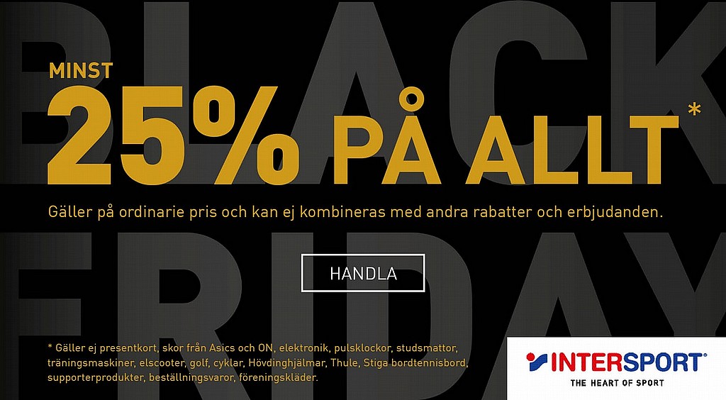 I samarbete med vår partner Intersport vill vi göra er uppmärksamma på Black Friday den 25–29 november. Massa superklipp och minst 25% på allt i butik och på intersport.se. När du handlar på Intersport är du samtidigt med och stöttar Dalstorps IF. För du har väl valt vår förening att stötta extra på ”Mina sidor”?